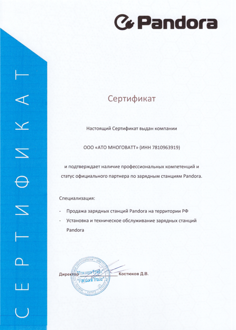 «АТО Многоватт» - сертифицированный дилер PANDORA на территории РФ. Отлично знаем продукт, умеем с ним работать и готовы осуществить полный комплекс поддержки клиентов на этапе монтажа, гарантии и пост-гарантийного периода.